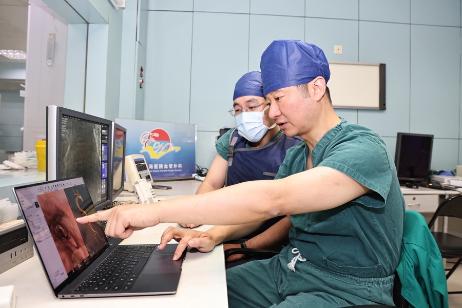 “AI会基于主动脉夹层治疗病例数据,计算每套方案的并发症概率,但最终选择需要医生权衡患者个体情况。”陆清声团队经过多学科会诊,考虑到张先生肺功能差、无法耐受长时间手术,且AI提示方案一的脑缺血风险可通过“左颈总动脉烟囱支架”技术降低,最终确定采用方案一,并启用血管介入手术机器人辅助操作。